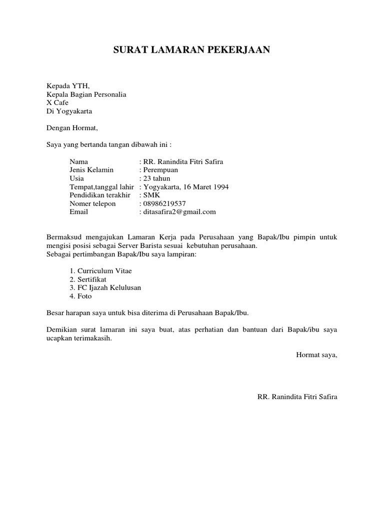 20+ Contoh Surat Lamaran Kerja untuk Berbagai Keperluan ... from lezgetreal.com Check spelling or type a new query. We did not find results for: Maybe you would like to learn more about one of these? Contoh surat lamaran kerja di warung kopi.
